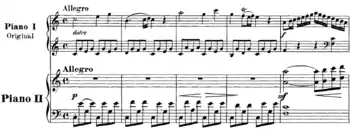 In 1876–1877, Edvard Grieg arranged this sonata for two pianos, by adding further accompaniment on the second piano part, whilst the first piano part plays the original as Mozart wrote it.[3] "In trying to 'impart to several of Mozart's sonatas a tonal effect appealing to our modern ears', Grieg left a telling little document or two on just what those late nineteenth-century Norwegian ears expected."[4] One notable recording is that of Elisabeth Leonskaja accompanied by Sviatoslav Richter (1996).[5]