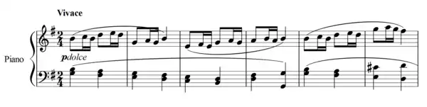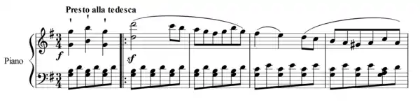 The Piano Sonata No. 25 in G major, Op. 79, was written by Ludwig van Beethoven in 1809. It is alternatively titled "Cuckoo" or "Sonatina," and it is notable for its shortness.[1] A typical performance lasts only about nine minutes.[2] The work is in three movements: a fast-paced Presto alla tedesca, a slower Andante, and a lively Vivace.