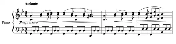 The andante movement, in G minor, uses a tranquil theme in 9