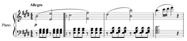 The first movement opens with a series of ascending fourths in the right hand, followed by a quartet-like echoing of a phrase in different octaves. The second theme, in B major, is based on a descending run followed by an ascending chromatic run. The development is full of sixteenth-note arpeggios in the left hand, and sixteenth-note left-hand scales accompany the start of the recapitulation, but the movement ends quietly.