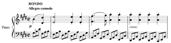 The third movement is in a lively sonata rondo form. On its final return, the main theme is syncopated against triplets.