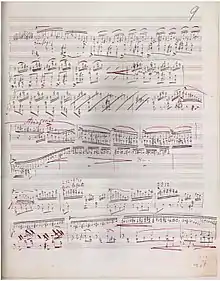 Liszt noted on the sonata's manuscript that it was completed on February 2, 1853,[1] but he had composed an earlier version by 1849.[2][3] At this point in his life, Liszt's career as a traveling virtuoso had almost entirely subsided, as he had been influenced towards leading the life of a composer rather than a performer by Carolyne zu Sayn-Wittgenstein almost five years earlier.[4] Liszt's life was established in Weimar and he was living a comfortable lifestyle, composing, and occasionally performing, entirely by choice rather than necessity.