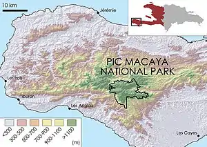 Pic Macaya National Park (French: Parc National Pic Macaya) is one of two national parks of the Republic of Haiti. It is located in the country's southern peninsula, within the Massif de la Hotte. Featuring the country's last stand of virgin cloud forest, it encompasses more than 8,000 hectares. Elevations in the rugged park reach a maximum height of 2,347 meters (7,700 feet) above sea level at Pic Macaya (Macaya Peak), the second highest point in Haiti behind Pic la Selle.[3] A majority of the park is composed of two tall peaks: Pic Macaya and Pic Formon.