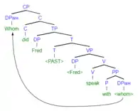 Pied-piping is an aspect of syntactic discontinuities, having to do with constituents that can and cannot be discontinuous.[4] While pied-piping is most visible in cases of wh-fronting of information questions and relative clauses, it is not limited to wh-fronting. It can also occur with almost any type of discontinuity, including extraposition, scrambling, and topicalization. Most, if not all, languages that allow discontinuities employ pied-piping to some extent. However, there are significant differences across languages in this area, with some languages employing pied-piping much more than others.[5]