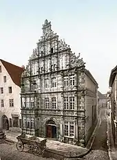 Although the stone façade dates from 1602, the building itself is much older. The façade was built for Mayor Hermann Arendes by the architects Johann Hundertossen and/or Eberhard Wilkening in the style of the Renaissance. The picture dated 1900 shows the adjacent legendary "Street without Music" with a view of buildings that no longer stand today. The stone structure pictured to the left of the Pied Piper's House is also no longer in existence.