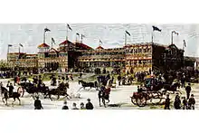 The main building constructed for the Exposition was 570 feet (170 m) long, 126 feet (38 m) wide, and two stories high.[5]