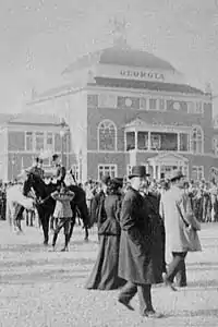 Exhibitors showed off a variety of items including works of art, local raw materials like manganese marble, and wood work.[8] Many prominent figures of the day were in attendance to see the displays. Governor David B. Hill of New York spoke at the event as well as President Grover Cleveland who attended with his young wife, Frances Folsom, on October 19.[2][9][10] Over 50,000 people were in attendance for Cleveland's speech.[7] The event closed on October 22 with a total attendance of about 200,000.[2] When the exposition was over, civic leaders said that it had successfully expanded Atlanta's reputation as a place to visit and to conduct business.[7]
