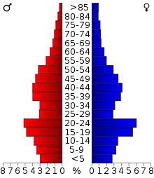 In the county, the population was spread out, with 24.40% under the age of 18, 17.00% from 18 to 24, 28.10% from 25 to 44, 20.80% from 45 to 64, and 9.60% who were 65 years of age or older. The median age was 32 years. For every 100 females there were 97.30 males. For every 100 females age 18 and over, there were 94.20 males.