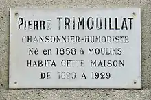 An 1899 reviewer said of his work that his modernist poems included elements derived from the 17th century work of Molière. He had a mischievous and caustic wit.[6] Starting in the early 1900s Trimouillat stopped performing apart from short appearances for charity. Trimouillat died in 1929.[1] He lived at 10, rue Chanoinesse from 1890 to 1929. His home is commemorated by a plaque.[7]