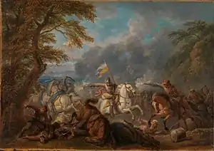 Because of his particular skill in the painting of horses, he was frequently invited to collaborate on the compositions of other local artists. An example is his cooperation with Balthasar van den Bossche on a portrait including a battle scene made for the Duke of Marlborough when he visited Antwerp after the Battle of Ramillies in 1706.[8] Van den Bossche painted the portrait while Pieter van Bloemen painted the horses. The work is now only known through the copy painted by Pieter van Bloemen on his own.[9]