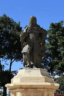 The design of a life-size statue of Vilhena which was commissioned by the knight Felician de Savasse in 1734 is also attributed to Troisi.[2] The statue was cast in bronze by Louis Bouchet, and it was installed in the piazza of Fort Manoel in 1736. The statue was relocated multiple times after 1858, and it is presently located in Pope John XXIII Square in Floriana.[5]