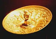 The Pietroasele Treasure (or the Petrossa Treasure) found in Pietroasele, Buzău, Romania, in 1837, is a late fourth-century Gothic treasure that included some twenty-two objects of gold, among the most famous examples of the polychrome style of Migration Period art. Of the twenty-two pieces, only twelve have survived, conserved at the National Museum of Romanian History, in Bucharest: a large eagle-headed fibula and three smaller ones encrusted with semi-precious stones; a patera, or round sacrificial dish, modelled with Orphic figures[1] surrounding a seated three-dimensional goddess in the center; a twelve-sided cup, a ring with a Gothic runic inscription, a large tray, two other necklaces and a pitcher. Their multiple styles, in which Han Chinese styles have been noted in the belt buckles, Hellenistic styles in the golden bowls, Sasanian motifs in the baskets, and Germanic fashions in the fibulae,[2] are characteristic of the cosmopolitan outlook of the Cernjachov culture in a region without defined topographic confines.