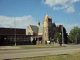 Also included in the district are five churches. The most significant are the 1881/81 Grace Episcopal Church and the 1896-1901 Church of the Immaculate Conception. The Grace Episcopal Church congregation was organized in 1878, and work on the current church began in 1881. The church is red brick, built in a vernacular Gothic Revival style. It has a crenelated tower, and fourteen stained glass, Gothic-arched windows. The Church of the Immaculate Conception is a Catholic church, serving a congregation that was first organized in 1844. Their first dedicated church building was constructed in 1860, and in 1866 the congregation was reorganized as the Church of the Immaculate Conception. The current church building was begun in 1896, and completed in 1901. It is a fieldstone structure, vernacularly designed in an Early Gothic Revival style. The main entryway is created by three decorated, Gothic-arched portals with two squared towers at the corners.[5]