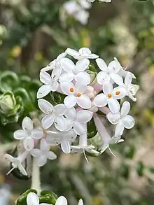 The shrub grows from 1.5 to 2 m tall, with width similar to its height. It has dark green leaves and white flowers which grow in clusters.[2]