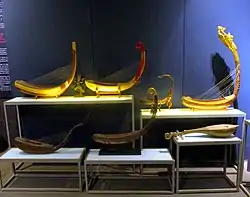 The pin (Khmer: ពិណ) is a Cambodian harp, one of the most historically important instruments in Cambodian music. The instrument went extinct c. 1500s, and is now being restored in modern times.[1] Its historical importance is emphasized by the very name for Cambodian classical music, pin-peat (Khmer: ពិណពាទ្). After the pin was no longer being used, Cambodians continued to use the instrument's name for classical music into the present era.[2] When the pin was no longer being used, the tonal range of other instruments was expanded, possibly to compensate.[3] Burmese saung gauk and roneats had more keys for the chromatic scale and the number of gongs in the kong von thom and kong toch "more than doubled in number since the musician depicted on the Angkorian carvings."[3]