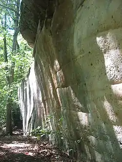 The Piney Creek Site is a prehistoric rock art site located on the north side of Piney Creek in Piney Creek Ravine State Natural Area in Randolph County, Illinois. The site consists of a sandstone outcropping with over 150 petroglyph and pictograph designs, the most at a single known site in Illinois. The designs are divided into four distinct groups; three of these are on the center and ends of the rock shelter's wall, while the fourth is on a joint block of sandstone within the shelter. Most of the designs were created during the Late Woodland and Mississippian periods, which spanned from 450 to 1550 A.D.; a number of the figures were added after 1550. A 1 metre (3 ft 3 in) tall spear-holding anthropomorph in the western group is the largest individual petroglyph in Illinois. In addition to anthropomorphs, other common designs at the site include zoomorphs, quadrupeds which probably represent deer, and symbols; the quadrupeds and anthropomorphs are frequently depicted in motion. The rock shelter was likely used as a religious site by prehistoric inhabitants, and several of the designs appear to have mystical or spiritual significance; for instance, the winged anthropomorphs likely represent shamans.[2]