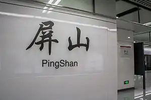 Pingshan Station (Chinese: 屏山站; pinyin: Píngshān zhàn; Fuzhounese: Bìng-săng) is a metro station of Line 1 of the Fuzhou Metro. It is located on the intersection of Guping Road, Qiantang Lane and Yeshan Road in Gulou District, Fuzhou, Fujian, China. It started operation on Jan 6, 2017.[1][2]