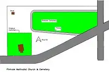 The Pinhook Cemetery, established in 1850, is divided into four sections with a single gravel road entering off of State Road 2 near the intersection of Wozniak Road and exiting onto Wozniak Road on its east boundary. It is bordered by State Road 2 on the south, Wozniak Road on the east, and agricultural tilled lands on the north and west. The church is located in its southwest corner. State Road 2 forms a gentle curve northward from the west edge of the cemetery to Wozniak Road. The cemetery is fenced on the east side, and partially on the south side, by a white vinyl picket fence. Newer brick piers flank the entrance and exit. Several mature deciduous and cedar trees are located in the cemetery.[2]