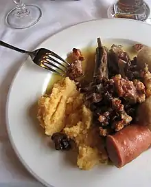 Pinnekjøtt (Norwegian pronunciation: [ˈpɪ̂nːəˌçœt]) is a traditional Norwegian main course dinner dish based on lamb ribs. Pinnekjøtt is a festive dish typical to Western and Northern Norway, and is rapidly gaining popularity in other regions as well. This dish is largely associated with the celebration of Christmas and frequently paired with puréed rutabaga, sausages and potatoes, served with beer and akevitt.[1]