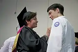 A pinning ceremony is a symbolic welcoming of newly graduated or soon-to-be graduated nurses into the nursing profession.[3][7][8] It sometimes recognizes the completion of educational requirements that enable nurses to take their state licensing examinations.[1] The ceremony is not a graduation, as it does not signify the completion of all criteria necessary to earn a nursing degree.[2] At some nursing schools, the pinning ceremony is held a few weeks before commencement.[3]