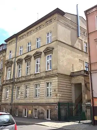 This tenement at then Hoffmann straße 7 has been designed as a renting house by the landlord, Karl Roßoll, living at nearby Hempel straße (now 3 Maja street).[32] From 1927 to 1938,[33] the premises housed the Municipal Institute of Music (Polish: Miejski Instytut Muzyczny), before it moved to 71 Gdańska Street.[34]