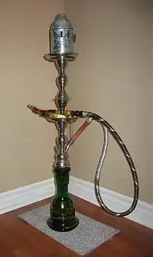 A hookah, ghelyan, or narghile, is a Middle Eastern water pipe that cools the smoke by filtering it through a water chamber. Often ice, cough-drops, milk, or fruit juice is added to the water. Traditionally, the tobacco is mixed with a sweetener, such as honey or molasses. Fruit flavors have also become popular. Modern hookah smokers, especially in the US, smoke "me'assel", "moassel", "molasses" or "shisha", all names for the same wet mixture of tobacco, molasses/honey, glycerine, and often, flavoring. This style of tobacco is smoked in a bowl with foil or a screen (metal or glass) on top of the bowl. More traditional tobaccos are "tombiek" (a dry unflavored tobacco, which the user moistens in water, squeezes out the extra liquid, and places coals directly on top) or "jarak" (more of a paste of tobacco with fruit to flavor the smoke).