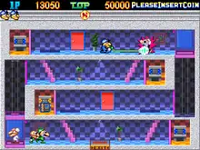 Along the way, players can defend against enemies by shooting their laser beam weapon and depending how long the beam is held on, enemies will fall off to the platform below or out the playfield but they respawn from behind closed doors.[3][6] Players traverse the stages through stairs and elevators, which can also be used by enemies as well. The player characters can also perform a sliding kick when the elevator door are opening or closing and this tactic can also be used to defeat enemies. On occasions, an "H" coin appears to be collected and depending on the number of coins collected before clearing all four stages, the woman on the picture takes more of her clothes.[3][6] After setting up the time bombs, players only have twenty seconds to exit before the bombs detonate but if the players characters are hit by an enemy, the area collapses but players are forced to clear the stage once again.[3][6]