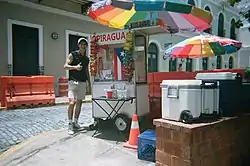 A piragua vendor is known as a piragüero. Most piragüeros sell their product from a colorful wooden pushcart that carries an umbrella, instead of from a fixed stand or kiosk.