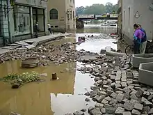 In August 2002, the town suffered great damage during the widespread flooding in Europe, reaching its apex on 16 August. Two factors greatly worsened the effect: First, the large earthen structure supporting the railway line acted as a dam, retaining the waters both longer and higher on the towns' side. Second, all the shop-fronts which had been renovated post-unification were practically all kind of sealed in terms of water-tightness: the floodwaters rose outside whilst the shops themselves stayed dry inside; but when reaching certain critical points, the weight of the water then suddenly destroyed these shop-fronts when the windows broke. Ironically, older "leaky" shopfronts did not suffer this fate, as the water built up height and thus pressure equally on both sides. Whilst international media mainly concentrated on the impact upon Dresden the impact upon Pirna was proportionately much worse. Schöna and Bad Schandau were also affected heavily.