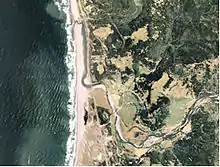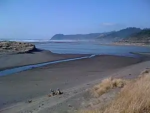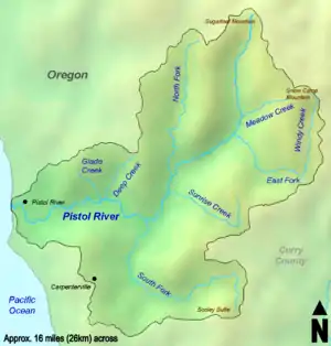 The Pistol River is a coastal stream that meanders for 21 miles (34 km)[4] through the Southern Oregon Coast Range to the Pacific Ocean near the unincorporated community of Pistol River in the U.S. state of Oregon. Flowing generally southwest from its origin near Sugarloaf Mountain in the Siskiyou National Forest, the river enters the sea at Pistol River State Scenic Viewpoint,[7] 10 miles (16 km) south of Gold Beach.[8] The river received its name after pioneer James Mace lost his pistol in it in 1853.[1][9]