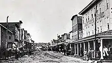As many residents were temporary, Pithole had a total of 54 hotels ranging from simple rooming houses to luxury hotels like the Chase and Danforth Houses, or the Bonta House located in Prather City on the bluff on the opposite side of Pithole Creek.[30] The Astor House, Pithole's first hotel, was built in one day. Construction of the hotel was especially poor; a lack of insulation and innumerable gaps in the walls made conditions in the hotel miserable during the winter.[31] At one point, the Pithole Post Office, located on the first-floor of the Chase House, was the third-busiest in the state of Pennsylvania, behind Philadelphia and Pittsburgh.[4] Three different churches—Catholic, Methodist and Presbyterian—were constructed by their respective congregations. Pithole's local newspaper, the Pithole Daily Record was started on September 5, 1865. The largest building in Pithole—the three-story, 1,100-seat Murphy's Theater—opened on September 17.[32] Among all the glamour, "every other building [in Pithole] was a bar".[6] Prostitution was rampant in Pithole, with most of the brothels built along First Street. Although the borough council passed ordinances banning the sex trade and carried out raids in an attempt to enforce them, they had little impact.[33]