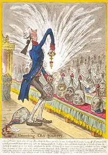 Throughout the 1790s, the war against France was presented as an ideological struggle between French republicanism vs. British monarchism with the British government seeking to mobilise public opinion in support of the war.[50] The Pitt government waged a vigorous propaganda campaign contrasting the ordered society of Britain dominated by the aristocracy and the gentry vs. the "anarchy" of the French revolution and always sought to associate British "radicals" with the revolution in France.[51] Though the Pitt government did drastically reduce civil liberties and created a nationwide spy network with ordinary people being encouraged to denounce any "radicals" that may have been in their midst, the historian Eric Evans argued the picture of Pitt's "reign of terror" as portrayed by the Marxist historian E.P. Thompson is incorrect, stating there is much evidence of a "popular conservative movement" that rallied in defence of King and Country.[52] Evans wrote that there were about 200 prosecutions of "radicals" suspected of sympathy with the French revolution in British courts in the 1790s, which was much less than the prosecutions of suspected Jacobites after the rebellions of 1715 and 1745.[51] However, the spy network maintained by the government was efficient. In Jane Austen's novel Northanger Abbey, which was written in the 1790s, but not published until 1817, one of the characters' remarks that it is not possible for a family to keep secrets in these modern times when spies for the government were lurking everywhere. This comment captures well the tense, paranoid atmosphere of the 1790s, when people were being encouraged to report "radicals" to the authorities.[53]