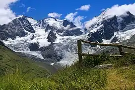 Piz Bernina (left), Piz Scerscen (centre) and Piz Roseg (right), seen from Val Roseg