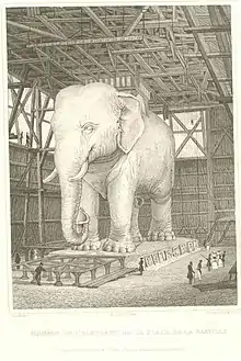 In 1808, as part of several urban improvement projects for Paris, Napoléon planned to have a monument in the shape of an elephant built here, the Elephant of the Bastille. It was designed to be 24 m (78 ft) in height, and to be cast from the bronze of cannons taken from the Spanish. Access to the top was to be achieved by a stairway set in one of the legs. However, only a full-scale plaster model was built. Victor Hugo immortalized the monument in the novel Les Misérables where it is used as a shelter by Gavroche. The monument was demolished in 1846.