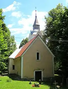The local parish church is dedicated to the Prophet Elijah and belongs to the Roman Catholic Diocese of Novo Mesto. It was built in around 1730 and extended in the late 18th century. It was renovated in the early 21st century.[9]