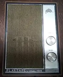 PlayTape is a 1⁄8 inch (3.2 mm)[2] audiotape format and mono or stereo playback system introduced in 1966 by Frank Stanton.[3] It is a two-track system, and was launched to compete with existing 4-track cartridge technology. The cartridges play anywhere from eight to 24 minutes, and are continuous. Because of its portability, PlayTape was an almost instant success, and over 3,000 artists had published in this format by 1968. White cases usually meant about eight songs were on the tape.[4]