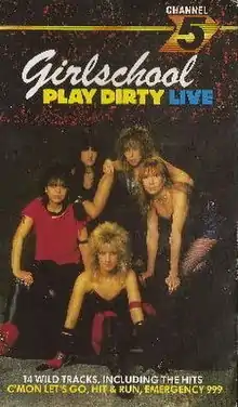 Play Dirty Live is the first video album released by the British heavy metal band Girlschool in 1985. The American release of the VHS was done by Polygram, the label that had Girlschool under contract at the time. The release of the video was part of the marketing strategy to launch the studio album Running Wild in the US, the only country where it was published. The British edition was instead licensed to Castle Communications and released at the same time. The concert was filmed by Trillion Pictures at the Camden Palace Theatre in London on 7 December 1984 for the British TV show Live from London. The band, which had been recently augmented to a five-piece group, was still recording Running Wild and presents in this show five new songs from the upcoming album.[1] The following songs have their titles wrongly indicated on the sleeve of the VHS: "Out to Get You" (Future Flash), "Ready to Rock" (Are You Ready?), "Emergency 999" (Emergency). The song "I Like It Like That" is the B-side of the "20th Century Boy" 12 inches single.[2]