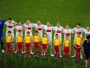 The UEFA Euro 2000 was one of the first major events where player escorts appeared with every footballer, replacing the previous practice where the players on the team linked arms with each other.[2] In club games children are usually members of youth teams or contest winners.[4] Since 2002, World Cup or European Championship escorts are selected in a competition hosted by McDonald's, sponsor of the event.[5][6]