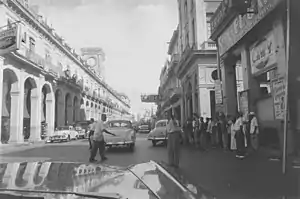 The district has two paifang,[21][lower-alpha 1] the larger one located on Calle Dragones. The long-neglected Chinatown in Havana, Cuba, received materials for its paifang from the People's Republic of China as part of the Chinatown's gradual renaissance.[22] China donated the materials in the late 1990s.[23] It has a well defined written welcoming sign in Chinese and Spanish. The smaller arch is located on Zanja strip. Cuba's Chinese boom ended when Fidel Castro's 1959 revolution seized private businesses, sending tens of thousands of business-minded Chinese fleeing, mainly to the United States. Descendants are now making efforts to preserve and revive the culture.[7] Many of the businesses in the Plaza del Vapor were operated and owned by Chinese Cubans.