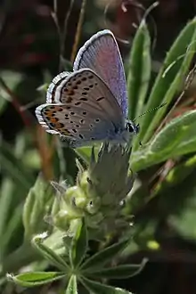 The Melissa blue (Plebejus melissa) is a butterfly of the family Lycaenidae. It is found in western North America, from Canada to Mexico. The Karner blue (Plebejus melissa samuelis) is a subspecies of the Melissa blue, and was described by the novelist/lepidopterist Vladimir Nabokov.