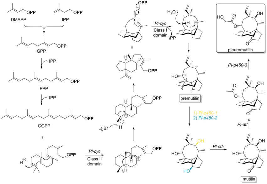 Pleuromutilin belongs to the class of secondary metabolites known as terpenes, which are produced in fungi through the mevalonate pathway (MEP pathway).[9] Its synthetic bottleneck lays on the production of the precursor GGPP and the following formation of the tricyclic structure, which is catalyzed by Pl-cyc, a bifunctional diterpene synthase (DTS). This Cyclase shows a new class II DTS activity, catalyzes a ring contraction and the formation of a 5-6-bicyclic ring structure. Specifically, DTS shows two catalytic distinguishable domains: On the one hand it has at the N-terminal region a class II DTS domain, which catalyzes a cascade cyclization, resulting in a decalin core. Subsequently, variable 1,2-proton and methyl shifts occur to translocate the carbocation towards one of the two interconnecting C-atoms and this intermediate induces a base-catalyzed ring contraction. Therefore, class II DTS promotes in general a ring contraction during the cyclisation of GGPP. On the other hand, at the C-terminal end it has a class I DTS domain, which catalyzes a conjugated dephosphorylation, generating the 8-membered cyclic core, followed by a 1,5-proton shift and a stereospecific hydroxylation to obtain premutilin.[10]