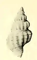 Sculpture : The protoconch is gradate, and coarsely, spirally, engraved. The subsequent whorls are rounded and excavate at the fasciole. The radial ribs are prominent, rounded, extending from the fasciole to the base, set their own breadth apart, about twelve to a whorl. The spirals are delicate threads overriding the radials. On the body whorl they amount to twenty-four, of which three or four on the periphery are larger than the rest. The fasciole is sharply sculptured by crescentic lamellae. The aperture is imperfect in the holotype. The sinus is sutural and of moderate depth.[2]