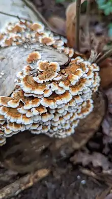 Plicaturopsis crispa is an effective participant in the initial phase of decay, colonizing predominantly dead branches of deciduous trees (Fagus and Betula) and is associated with a white rot.[9] A few years into the succession of wood decomposition, strong competitors such as Trametes versicolor and the split-gill fungus Schizophyllum commune often displace P. crispa.[9]