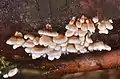 It forms clusters on typically deciduous trees on decomposing branches.[8][4] Fruit bodies are generally 1-3 cm in length with bracket-like semi-circular shell shapes. Upper surface is normally concentrically zoned getting paler as it approaches the edge. Underside is made up of pale forked folds, giving a gill-like appearance.[5] It produces white spores[5][4] which are small, narrow allantoid, weakly amyloid, and only 3–4.5 x 1–1.2 μm.[3]