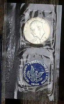 Pliofilm manufacture was hindered by the Japanese occupation of rubber-producing countries in Southeast Asia.[22] Commercial outputs were stopped and the entire production given over to military uses, leading to a large commercial demand and a backlog of orders after the war's end.[23][24] In the post-war years Pliofilm saw use as a food wrap, to package drugs and textiles, and as a means of laminating paper.[11][25] It was also marketed as Vitafilm.[25] Production was extended abroad to the Goodyear factory in Wolverhampton, England, in the late 1940s.[26] The United States Mint switched its packaging for mint set coins from Cellophane to Pliofilm in 1955.[27] The American Chemical Society awarded Harold J. Osterhof the 1971 Charles Goodyear Medal for inventing Pliofilm.[10] It remained commercially available in 1987.[4]