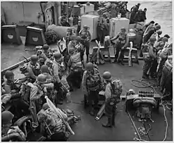 The United States Armed Forces used Pliofilm to waterproof firearms during World War II amphibious landings. Sleeves were produced in three sizes to suit pistols, rifles, and sub-machine guns and were sealed by tying a knot in the sleeve or with an elastic band.[18] It was intended that soldiers would tear off the sleeve after landing, though some troops kept them on inland due to fields having been flooded by the Germans as a defensive measure. The Pliofilm usually trapped enough air to keep the firearm buoyant if dropped in water. Because the sleeve prevented use of the weapon's regular sling some troops fashioned ad-hoc slings from rope that could be used over the Pliofilm.[18][19][20] The Houston Chronicle series "D-Day In Color" noted that Pliofilm wrapped around weaponry is evident in an image of United States Army infantry at the Normandy landings.[21]