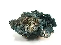 Plumbogummite is found in the oxidized zones of lead-bearing deposits. It commonly occurs as botryoidal, kidney shaped, stalactitic or globular crusts or masses, frequently with a concentric structure; rare crystals have a hexagonal outline. Pyromorphite and baryte are commonly associated minerals, and plumbogummite may be pseudomorphic after them. Other associated minerals include mimetite, duftite, cerussite, anglesite and wulfenite.[5]
