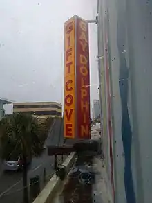 The Gay Dolphin Gift Cove is located at 916 North Ocean Boulevard in Myrtle Beach, South Carolina, United States, and calls itself "the nation's largest gift shop".[1] As of 2011, the Gay Dolphin had 26,000 square feet (2,400 m2)[2] and store owner Justin "Buz" Plyler said the store averaged 70,000 items.[3] Located in 50 sections called "coves",[4] including an Elvis Cove,[5] items include "sea shells, brushes for bald men and noisy seat cushions."[6] Larger items have included a fountain with three dolphins costing $7,000 and a life-size cigar store Indian.[6] Tom Pierce's Trader Bill's Shark's Tooth Cove rents space in the building. People can bring in their own shark teeth and have them made into jewelry.[7][8]