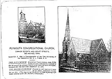 Under the leadership of Reverend A.L. Frisbie, 1871–1899, a new church was built in 1877 at the Northeast corner of 7th and Locust, this was Plymouth's first real church.[7] Pastor Frisbie and his wife Martha were both active in the anti-slavery and suffrage movements.[8] During his service as pastor, three groups went into the Des Moines community to form new congregations: Pilgrim, North Park and Greenwood churches. In 1900 the church planned a new grand building at Eighth and Pleasant Streets downtown. The church was built on what came to be known as "Piety Hill."[6] Parking became a problem at the downtown location as the church grew to 1300 members. Under pastor Frances VanHorn a new church was built at 8th and Pleasant Street.[9][10] An advertisement from 1909 mentions a sermon entitled "Lincoln's Religion, the religion of Jesus and Ours - for big hearted, broad minded folk."[11] During World War I a fourth neighborhood church, Waveland was started.