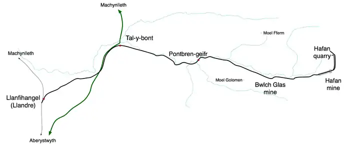 The Plynlimon and Hafan Tramway was a 2 ft 3 in (686 mm) gauge narrow gauge railway in Cardiganshire (now Ceredigion) in Mid Wales. It ran from Llanfihangel station (later renamed Llandre station) on the Cambrian Line, through the village of Tal-y-bont and the valley of the Afon Leri, into the foothills of Plynlimon Fawr. It was built to serve the lead mines at Bwlch Glas and stone quarries around Hafan[1] and opened in 1897, closing just two years later.[2] The line was a little over 7 miles (11 km) long and, despite running a short-lived passenger service, it served no communities of more than 100 people.